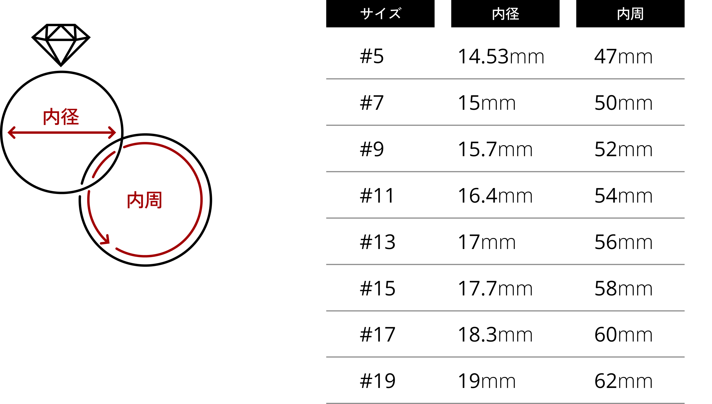内径: お手持ちのリングの内径を測定し、対応表 (内径) をご参照のうえサイズをご確認ください。